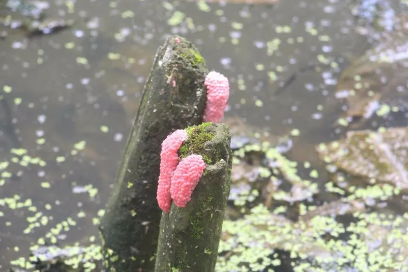 蕪雜的環境又滋生了大量的蚊蟲和具有血吸蟲病傳染危害的釘螺,水體散發出陣陣難聞的異味,讓人敬而遠之。如果稍稍觀察水岸邊,還會發現石塊和植物枝葉上有一團團紅色的異物,那是福壽螺產的卵,一種對環境產生很大破壞的入侵物種,它們不僅貪婪啃食周圍各種植物,還會因攜帶寄生蟲(如廣州管圓病蟲等)而傳播疾病,導致這一區域的水體生態環境進一步失衡,淪為一片死氣沉沉的臭水塘,嚴重影響了黑龍灘區域整體的水生態健康。