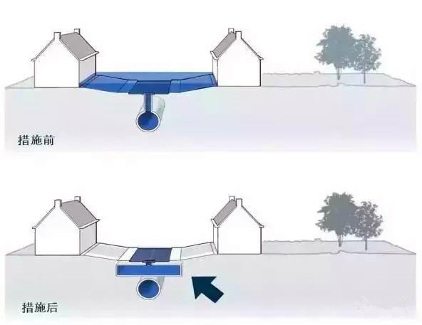 街道實際上已經起了儲水的作用。這一點可以有意識地加以利用,例如鋪設人行道邊緣石、加深街道。這是一個在短時間內有效且相對便宜的有控制的儲水方法。如果設計地巧妙,這些措施不會成為殘疾人、老人和孩子的障礙,也可以使商店更方便顧客進出。